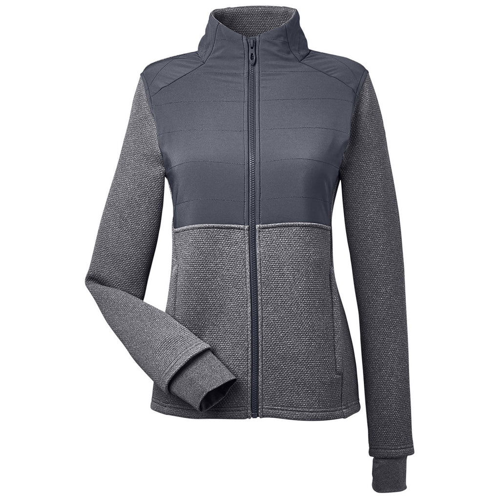 Add embroidery to the Spyder Women's Black Heather/Polar Pursuit Commuter Jacket for a fun and fashion forward look that functions almost any way you need it. The pillow tech fabric is quilted and has lightweight warmth retaining fill. Add a company logo to give as employee gifts or use as cooler weather employee apparel for those who have to be outdoors. The high-end jacket offers forward set shoulder seams, interior stretch storm cuffs, and thumb holes. Perfect for the morning commute or an upscale look for enjoying the great outdoors.