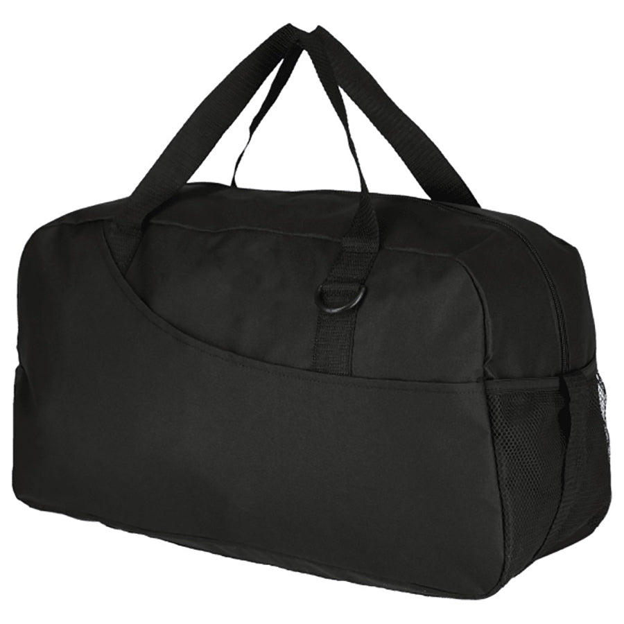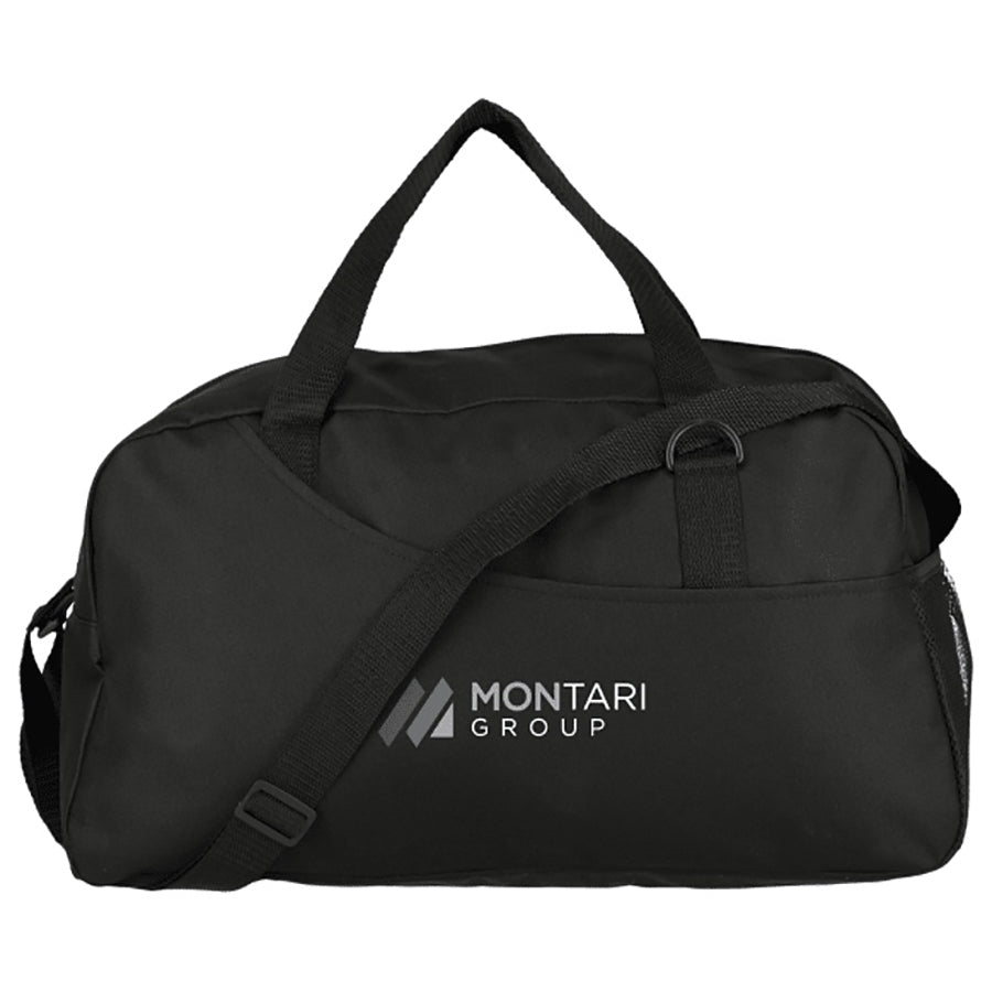 Want to provide your clients with a durable, eco-friendly duffle that combines style and functionality? Elevate your product offerings with the Swoop Recycled Duffle. Designed for convenience and durability, this duffle features a large, zippered main compartment for easy access to your belongings and a spacious open exterior front pocket for additional storage. The sturdy grab handles and key loop add practicality, while the mesh water bottle pocket on the side ensures hydration is always within reach.