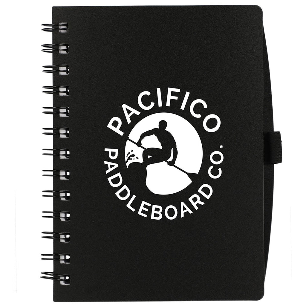 Great for students and professionals alike, the Bullet Black FSC Recycled Coordinator Spiral Notebook makes it easy to show off your company's custom logo or design to your desired audience. This eco-friendly spiral notebook includes smooth white lined paper and a convenient pen loop located on the back cover.