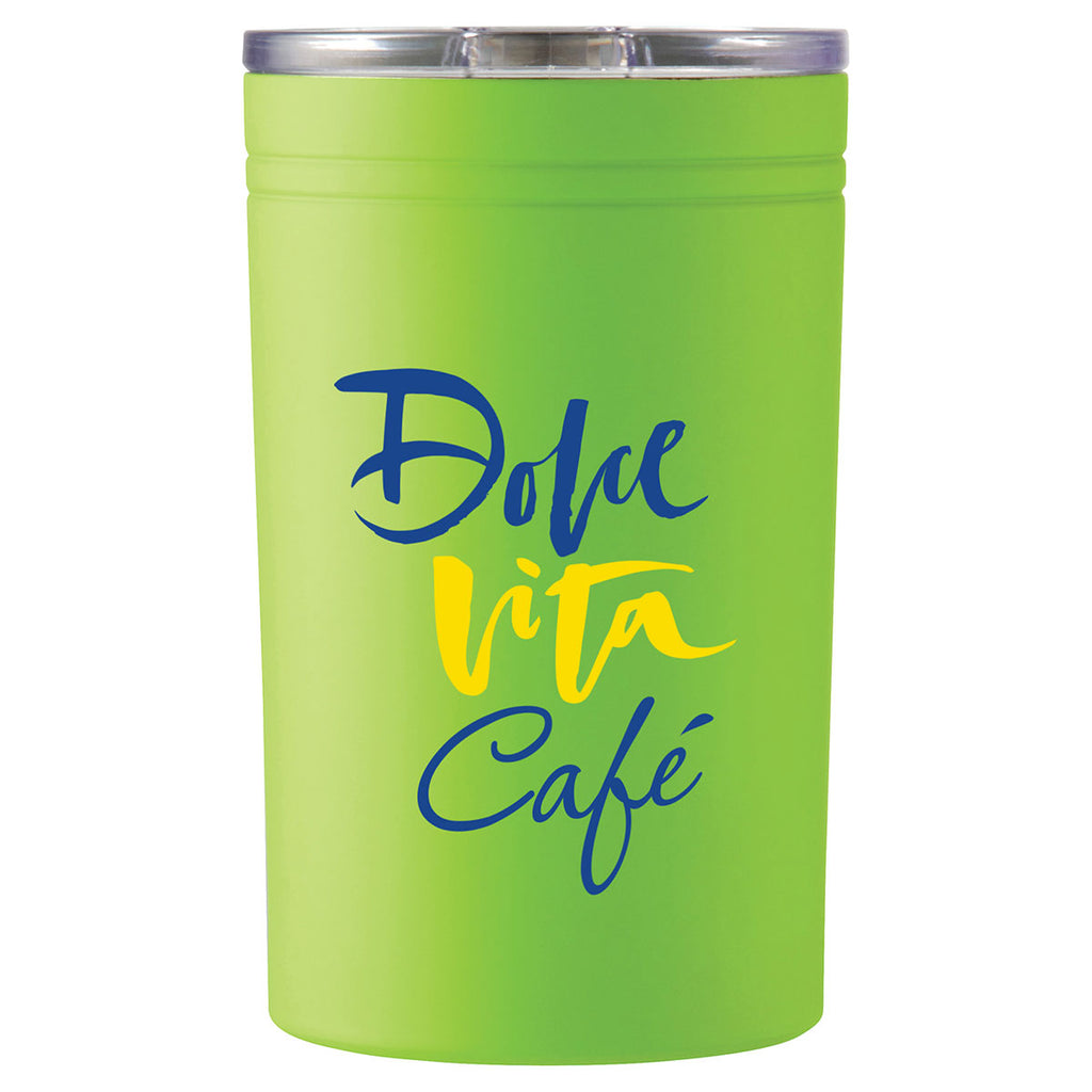 The vacuum insulated Bullet Lime Green Sherpa 11oz. Vacuum Tumbler & Insulator keeps drinks cold or hot throughout the day. Your custom logo printed on its body will stay intact no matter what goes inside the tumbler. Add this tumbler to your list of giveaway items for your employees during special events or hand them out as a promotional tool at recruiting events.The minimum order for this product is 50 pieces.