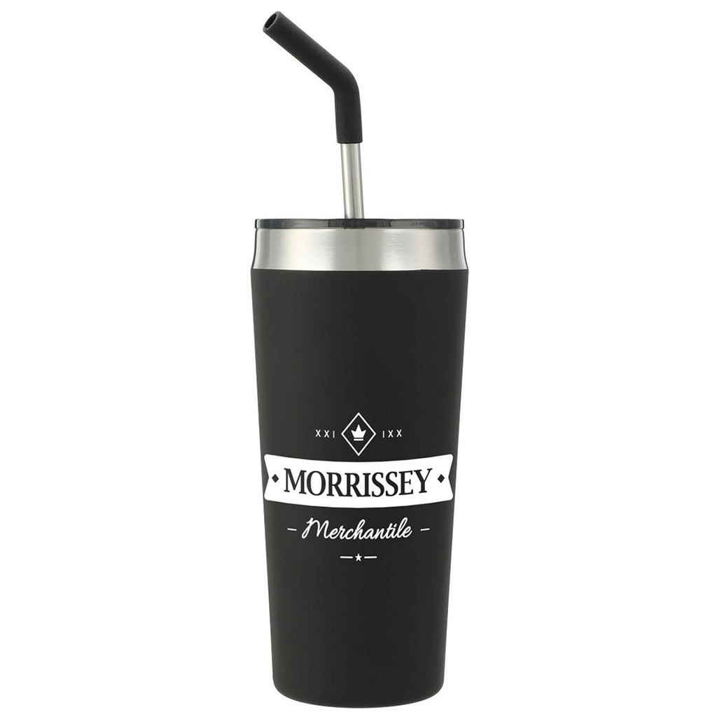 The Bullet Black Faye 20oz Vacuum Tumbler w/ SS Straw features double-wall stainless steel construction with vacuum insulation. Use it to keep your favorite beverages hot for five hours or cold for 15 hours. It has a food-grade stainless steel straw with a comfortable removable silicone tip for safe sipping. The spill-proof press-on lid, offers a slide closure. Reusable and dishwasher-safe, the included straw is an eco-friendly, environmentally responsible, and sustainable alternative to disposable plastic straws. Oder a sustainable and affordable drinkware option and add a custom-printed logo on the front.