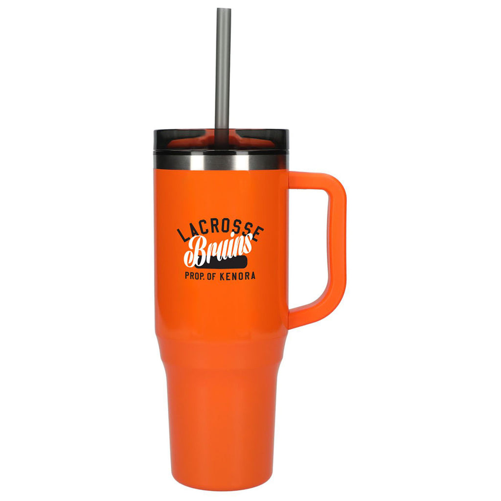 The Bullet Orange Thor 40 oz Eco-Friendly Straw Tumbler features durable double-wall construction to keep your beverages hot or cold in any environment. It has a 40 oz capacity for fewer refills in a slim base to fit into cup holders. The eco-friendly splash-proof lid offers a swivel opening that can fit a straw for two differing drinking options. Gift a sustainable drinkware item ideal for a tradeshow by adding a laser-engraved logo.