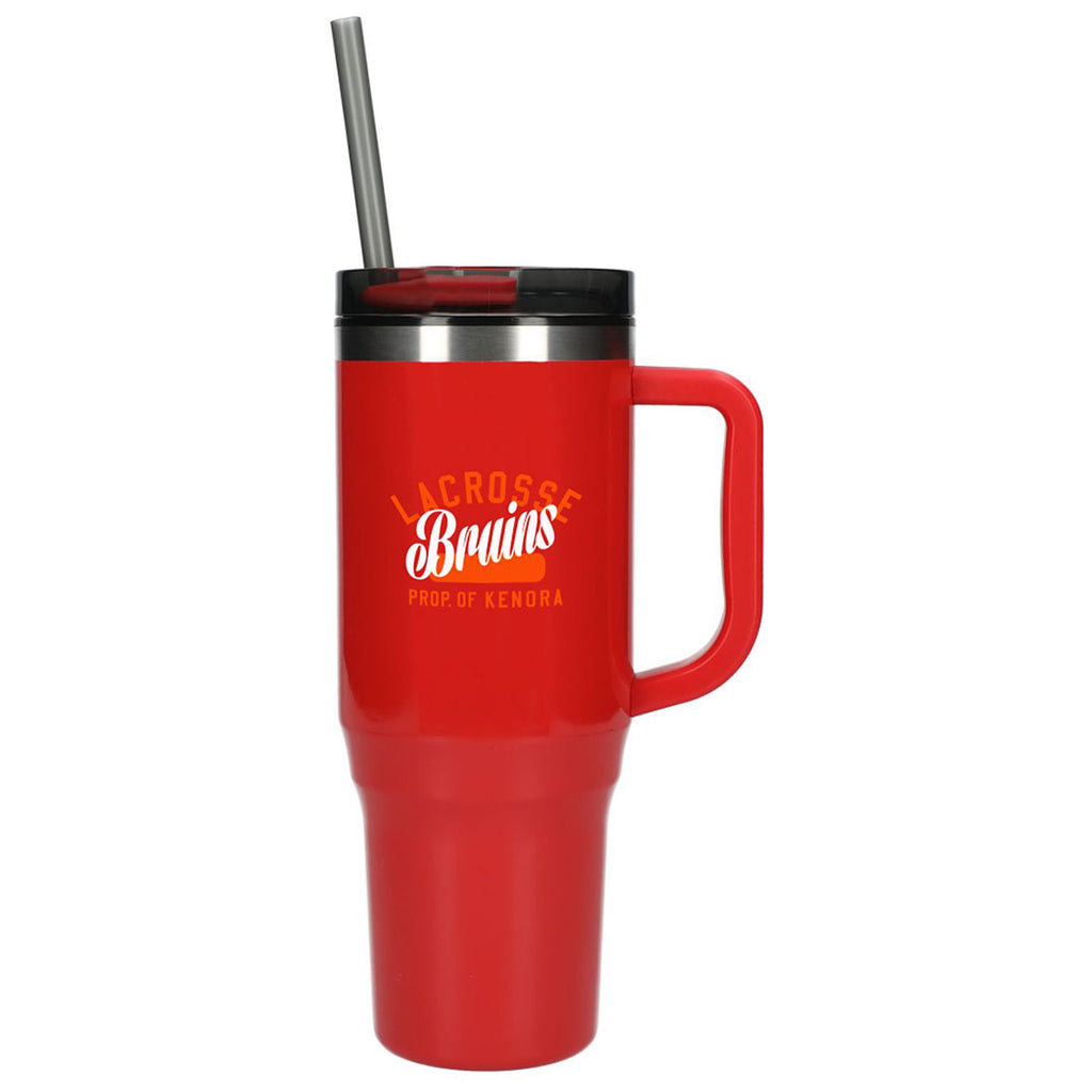 The Bullet Red Thor 40 oz Eco-Friendly Straw Tumbler features durable double-wall construction to keep your beverages hot or cold in any environment. It has a 40 oz capacity for fewer refills in a slim base to fit into cup holders. The eco-friendly splash-proof lid offers a swivel opening that can fit a straw for two differing drinking options. Gift a sustainable drinkware item ideal for a tradeshow by adding a laser-engraved logo.