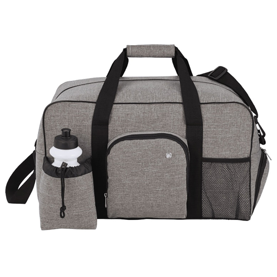 Travel in style with the Weekender 18.5" Deluxe Duffle Bag in Graphite—ideal for custom logo personalization and versatile use. Constructed from durable 600d polycanvas, this versatile bag is designed to meet all your travel needs. The zippered main compartment offers ample storage space, while the zippered front media pocket with an earbud port keeps your devices accessible and secure.