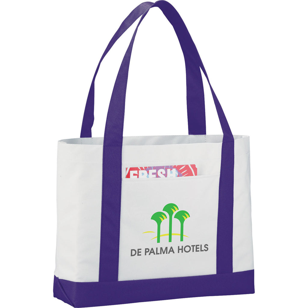 The Bullet White with Purple Trim Large Boat Tote is available in various color combinations that can help your corporate logo stand out. This bag is perfect for a day at the beach or a trip to the grocery store, making it a nice logoed promotional tool that boosts your brand recognition in numerous settings.