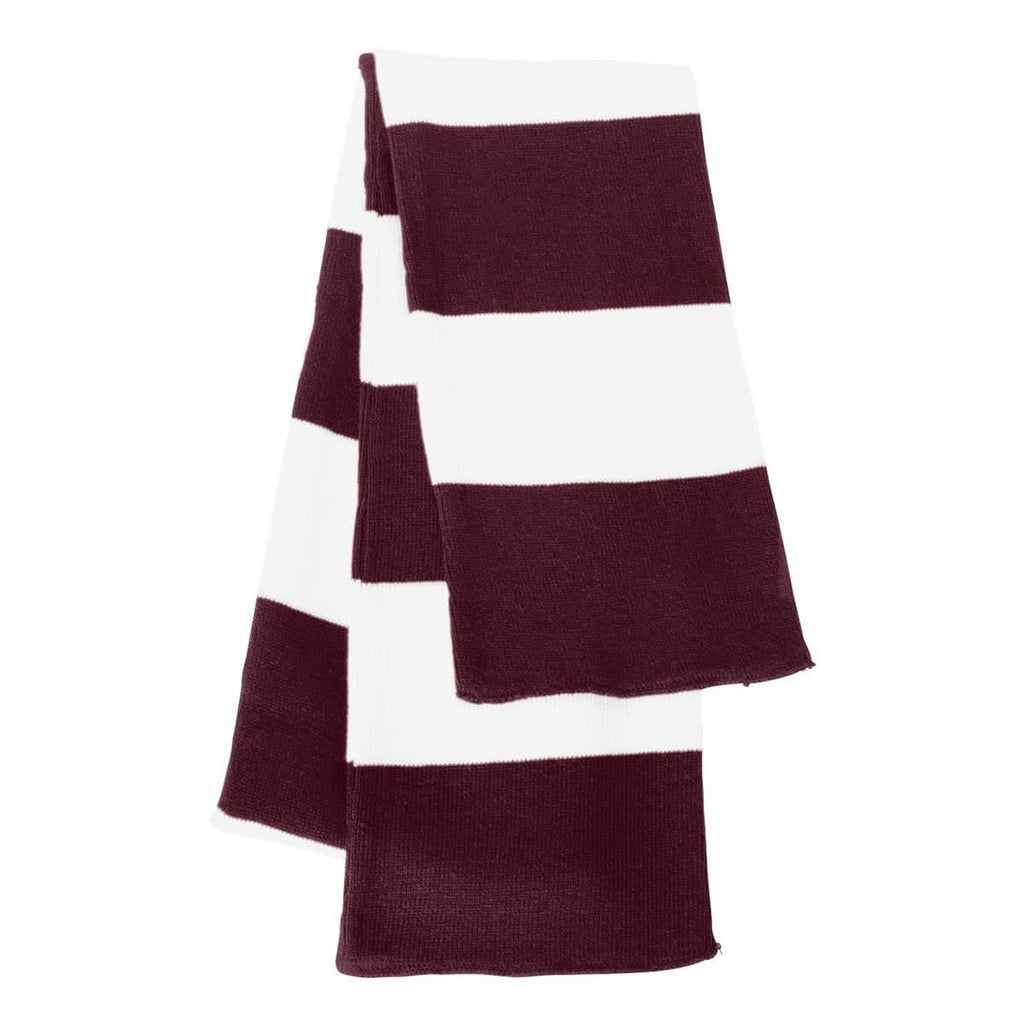 Protect yourself against the harsh weather or make a statement with a custom Sportsman Maroon/White Rugby Striped Knit Scarf. Made of 100% acrylic knit with a length of 69 inches and width of 7 1/4 inches, this scarf comes in a variety of color pairings. Add a custom logo to show support for the home team or a corporate embroidery to use these scarfs as corporate gifts for the holidays or any special occasion. Perfect for sporting events when the weather is unpredictable or to use as headwear when Mother Nature sends a cold blast. Place an order right away to be prepared for whatever comes next.Highlights
