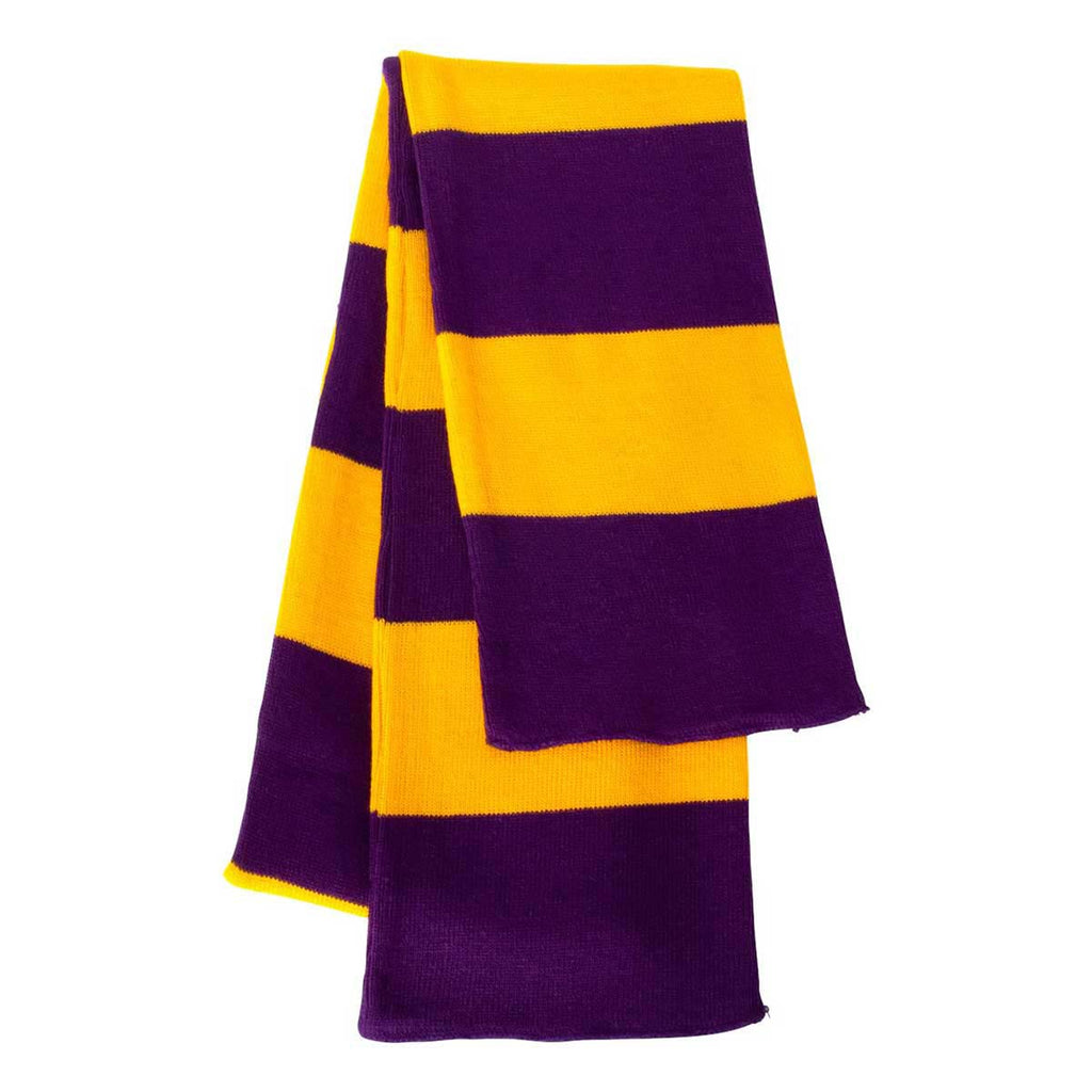 Protect yourself against the harsh weather or make a statement with a custom Sportsman Purple/Gold Rugby Striped Knit Scarf. Made of 100% acrylic knit with a length of 69 inches and width of 7 1/4 inches, this scarf comes in a variety of color pairings. Add a custom logo to show support for the home team or a corporate embroidery to use these scarfs as corporate gifts for the holidays or any special occasion. Perfect for sporting events when the weather is unpredictable or to use as headwear when Mother Nature sends a cold blast. Place an order right away to be prepared for whatever comes next.Highlights