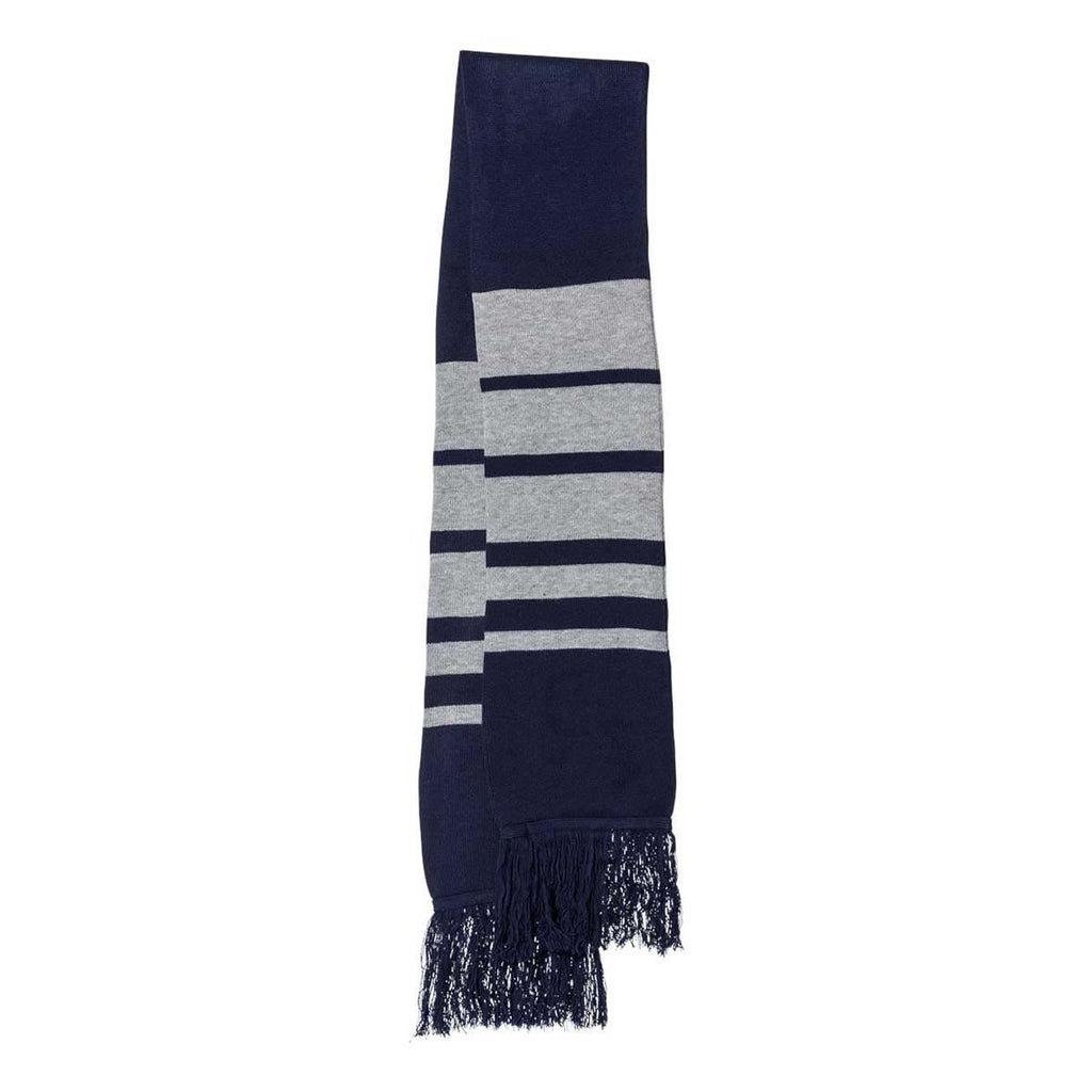 Protect yourself against the harsh weather or make a statement with a custom Sportsman Navy/Heather Grey Soccer Scarf. Made of 100% acrylic with a length of 61 inches and width of 7 inches, this scarf comes in a variety of color combinations, bright and bold, all with stripes. Add a custom logo to show support for the home team or a corporate embroidery to use these scarfs as corporate gifts for the holidays or any special occasion. Perfect for sporting events when the weather is unpredictable or to use as headwear when Mother Nature sends a cold blast. Place an order right away to be prepared for whatever comes next!Highlights