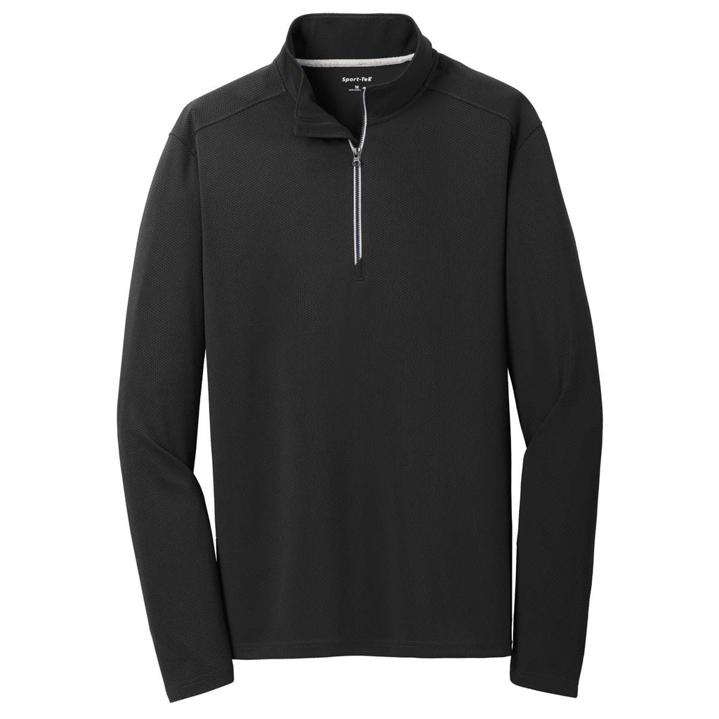 A good corporate quarter zip should be ready for anything. Armed with durable 100% polyester, the Sport-Tek Men's Black Textured 1/4-Zip Pullover is ready for anything and a little bit more. Not only is it comfortable, with the aforementioned fabric and a tag-free label that the back of your neck will thank you for, but it offers a chin guard, set-in sleeves, open cuffs and hem, and a contrast zipper & cadet collar. Add your company's custom logo to the left chest and you'll be ready to display your corporate branding in just about any situation, looking clean, professional, and ready for anything.Corresponding Women's Style:Sport-Tek Women's Black Sport-Wick Textured 1/4-Zip Pullover