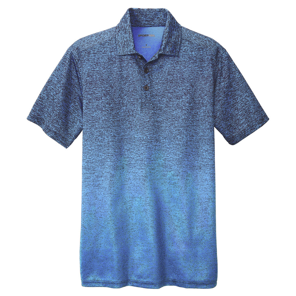 Designed with an allover sublimated print to create an innovative twist on traditional athletic colors, the company logoed Sport-Tek Men's Carolina Blue/True Navy Ombre Heather Polo sets the standard for versatile polos. Attach a custom logo on the large imprint area to leave a lasting positive impression on the potential customers you interact with at industry trade shows. Snag resistant to prevent tearing, the sleek polo includes a self-fabric collar and open hem sleeves. Side vents encourage the circulation of air to cool the body when the competition heats up. Moisture wicking technology keeps the skin comfortably dry all day long. Switch up the usual corporate apparel with this ombre polo from Sport-Tek.