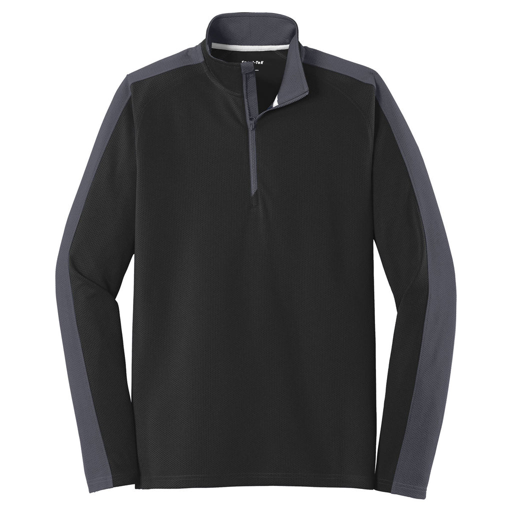 When you want to make a fashion statement at work or after work hours during a night on the town, you can't go wrong by wearing the Sport-Tek Men's Black/Iron Grey Sport-Wick Textured Colorblock 1/4-Zip Pullover. Designed with 100% polyester, the pullover quickly removes perspiration to cool the skin. The stylish cadet collar works in fashion harmony with the taped neck to present a dignified, yet casual appearance. Contrast stripe raglan sleeves give the pullover a sporty look. The large imprint area on the pullover makes the perfect spot to add a custom logo that promotes your company.Corresponding Women's Style:Sport-Tek Women's Black/Iron Grey Sport-Wick Textured Colorblock Quarter Zip Pullover