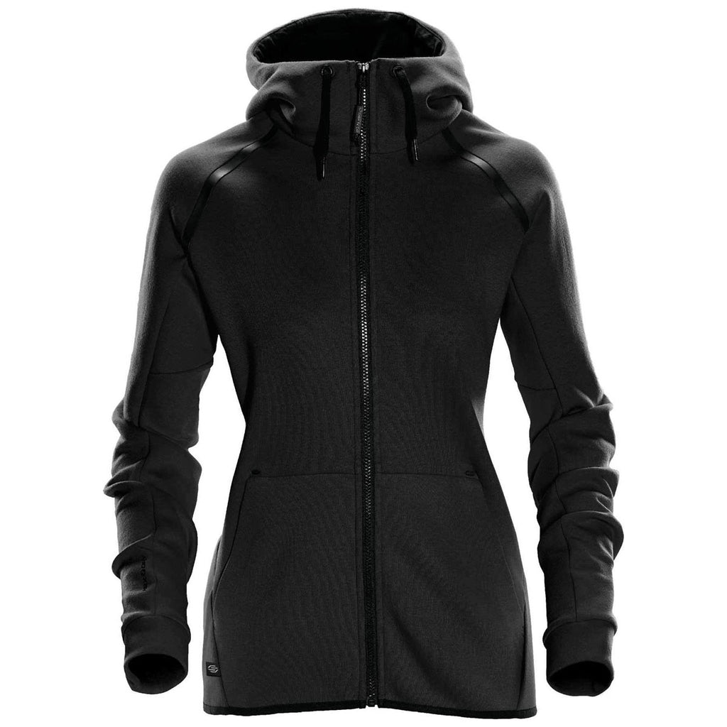 Your team will love to add the Stormtech Women's Black Reflex Hoody to their uniform when the weather turns cool. With stylish taping at the collarbone, slip pockets and full zip stand-up collar, this jacket is as functional at it is cute. There is room at the chest for custom company logo embroidery, making it a perfect choice for corporate gifts or employee apparel. Built to last, the articulated elbows and scuba hood will withstand continuous wear, even by the most active of employees. Finished with cotton/polyester fabric with H2X-DRY technology that wicks away moisture, your team will stay comfortable and dry all season long.Corresponding Men's Style:Stormtech Men's Black Reflex Hoody