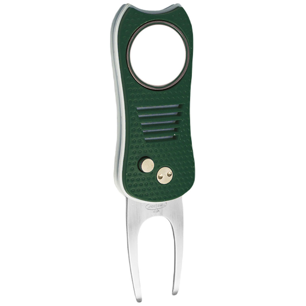 The Par One Green Team Golf Switchblade Divot Tool is a multipurpose item that everyone who loves to golf will want to get their hands on. This little tool comes complete with a lightweight aluminum blade, a soft grooved handle, and a double-sided removable magnetic ball marker - all its missing is your company's custom logo or design.Highlights