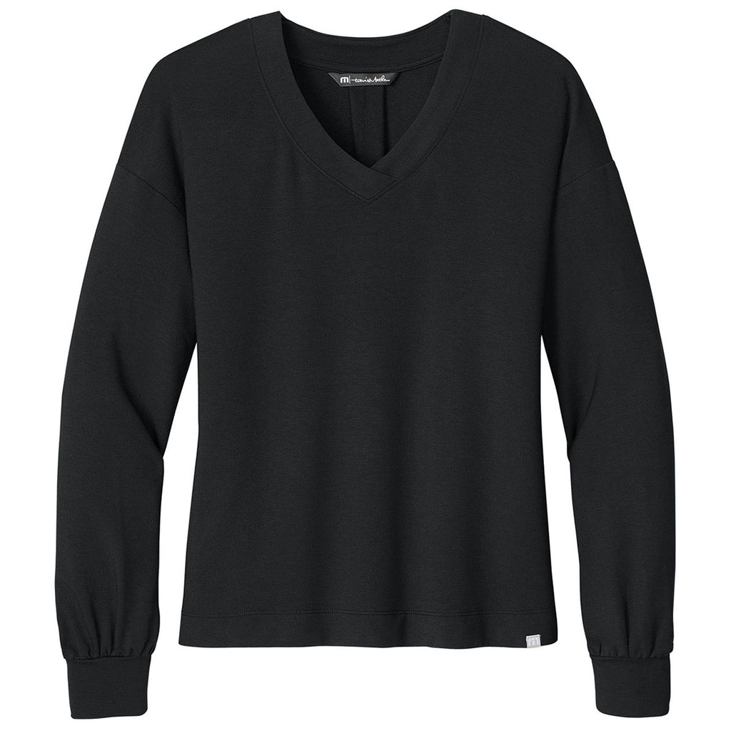 With a corporate design, TravisMathew Women's Black Long Weekend V-Neck delivers a casual yet refined style with its flattering fit and soft fabric. The V-neckline adds a touch of sophistication, while the breathable material ensures all-day comfort. Perfect for relaxed weekends or casual workdays, this shirt pairs well with jeans or skirts, offering effortless style.