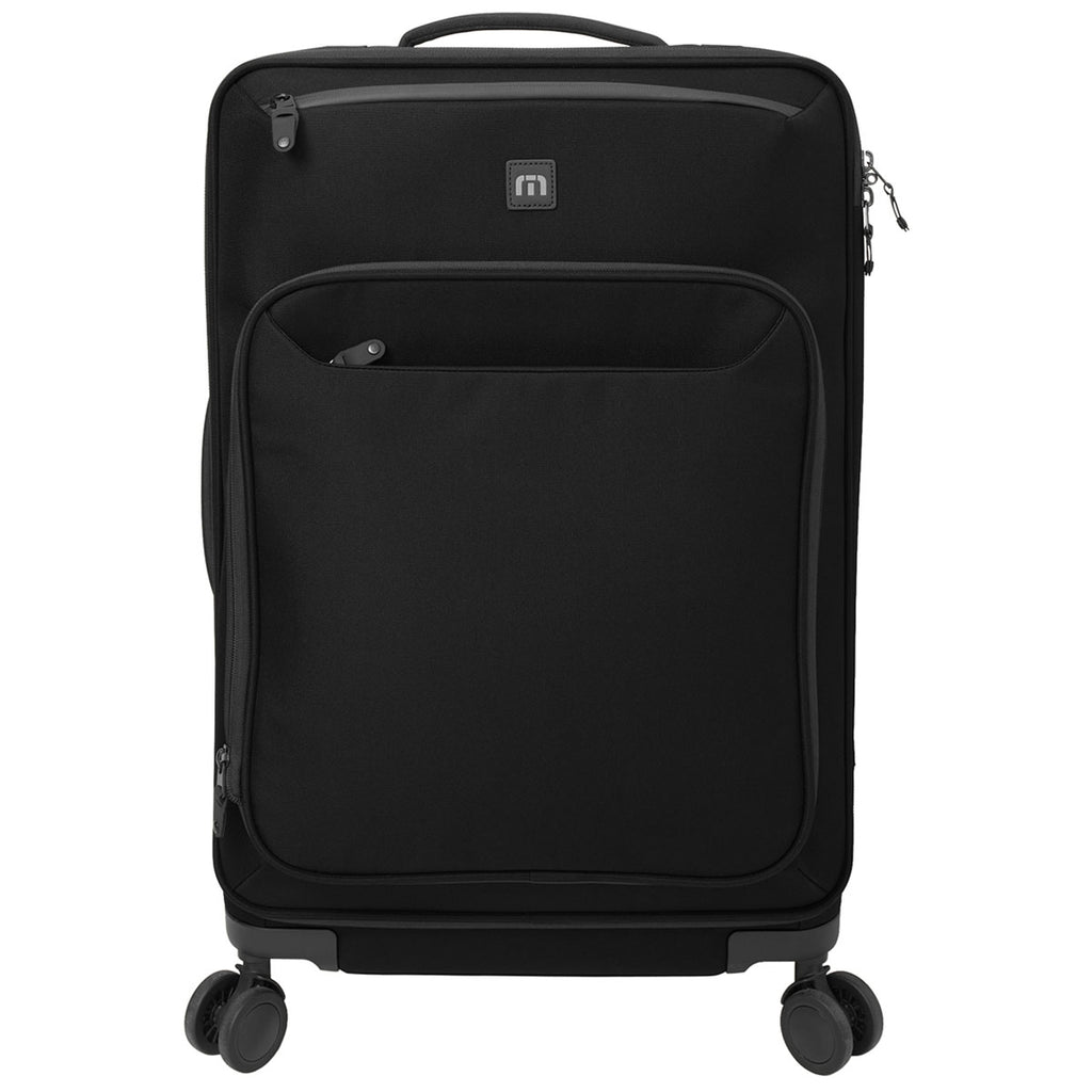 TravisMathew Black Quad Checked Spinner with custom embroidery is a stylish way to travel. Perfect for cruises, vacation, and overnights, the Quad checked spinner is water repellant, has a large main compartment with compression straps, side handle, retractable handle, and spinning wheels for stability. Place an order right away.