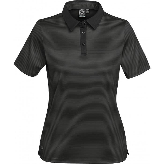 Put your company logo on a polo with style. The Stormtech Women's Carbon/Black Vibe Performance Polo has a variegated stripe pattern that will turn heads and help call attention to your company name. It has features like moisture-wicking technology and mechanical stretch to ensure a comfortable fit. Give it as a corporate gift or incorporate it as part of a uniform.Corresponding Men's Style: Stormtech Men's Carbon/Black Vibe Performance Polo