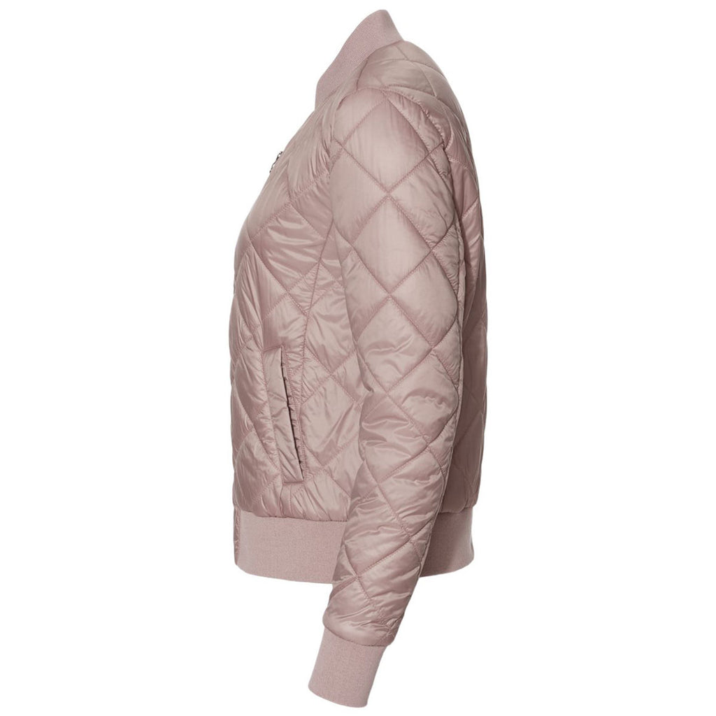 Design embroidery for the Weatherproof Women's Blush Heat Last Quilted Packable Bomber for a creative look that also keeps you warm as you go about your day. The diamond quilted design has a coated nylon shell with polyester fill that is both wind and water resistant. A ribbed knit collar, cuffs, and waistband are a creative design that many will adore and recognize. Add a company logo to give as employee gifts to those who work their hardest. Open welt pockets keep your small items at hand as needed and when the weather warms, this bomber folds and stows into a separate pouch.Highlights