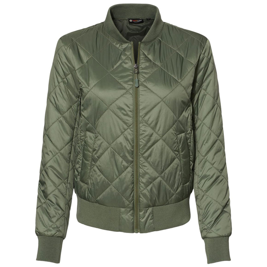 Design embroidery for the Weatherproof Women's Olive Grey Heat Last Quilted Packable Bomber for a creative look that also keeps you warm as you go about your day. The diamond quilted design has a coated nylon shell with polyester fill that is both wind and water resistant. A ribbed knit collar, cuffs, and waistband are a creative design that many will adore and recognize. Add a company logo to give as employee gifts to those who work their hardest. Open welt pockets keep your small items at hand as needed and when the weather warms, this bomber folds and stows into a separate pouch.Corresponding Men's Style:Weatherproof Men's Olive Grey Heat Last Quilted Packable Bomber