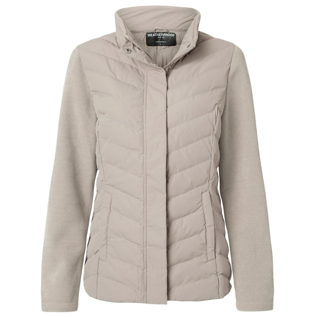 Weatherproof Women's Taupe Mixed Media Chevron Jacket allows for custom embroidery while blending style with performance. Its unique chevron design and lightweight poly fill deliver warmth and contemporary fashion. Perfect for commuting or outdoor layering, this jacket provides reliable protection, versatile wear, and a flattering fit for women seeking comfort, modern aesthetics, and professional-ready appeal.Highlights