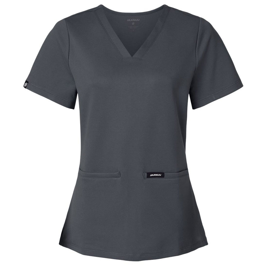 Add a custom logo to the Jaanuu Women's Carbon Grey Cesi Ultrasoft Scrub V-Neck Top for a fashionable option for all your scrub top needs. The slim fitting top has two welt pockets and side vents to keep you comfortable as you see patients, handle emergencies, or hang out at home. A truly versatile option that is perfect for daily wear.Highlights