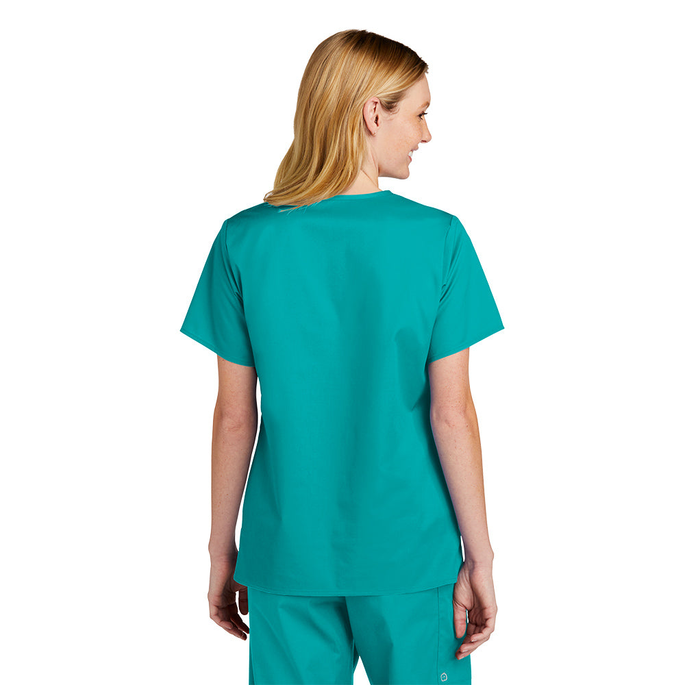 Outfitting female healthcare professionals starts with the WonderWink Women's Teal Blue WorkFlex V-Neck Top. A great place for you to add your company's custom logo, this stylish piece of apparel is made from a comfortable mechanical stretch fabric and includes awesome extras like a shoulder badge loop and dual front pockets.
