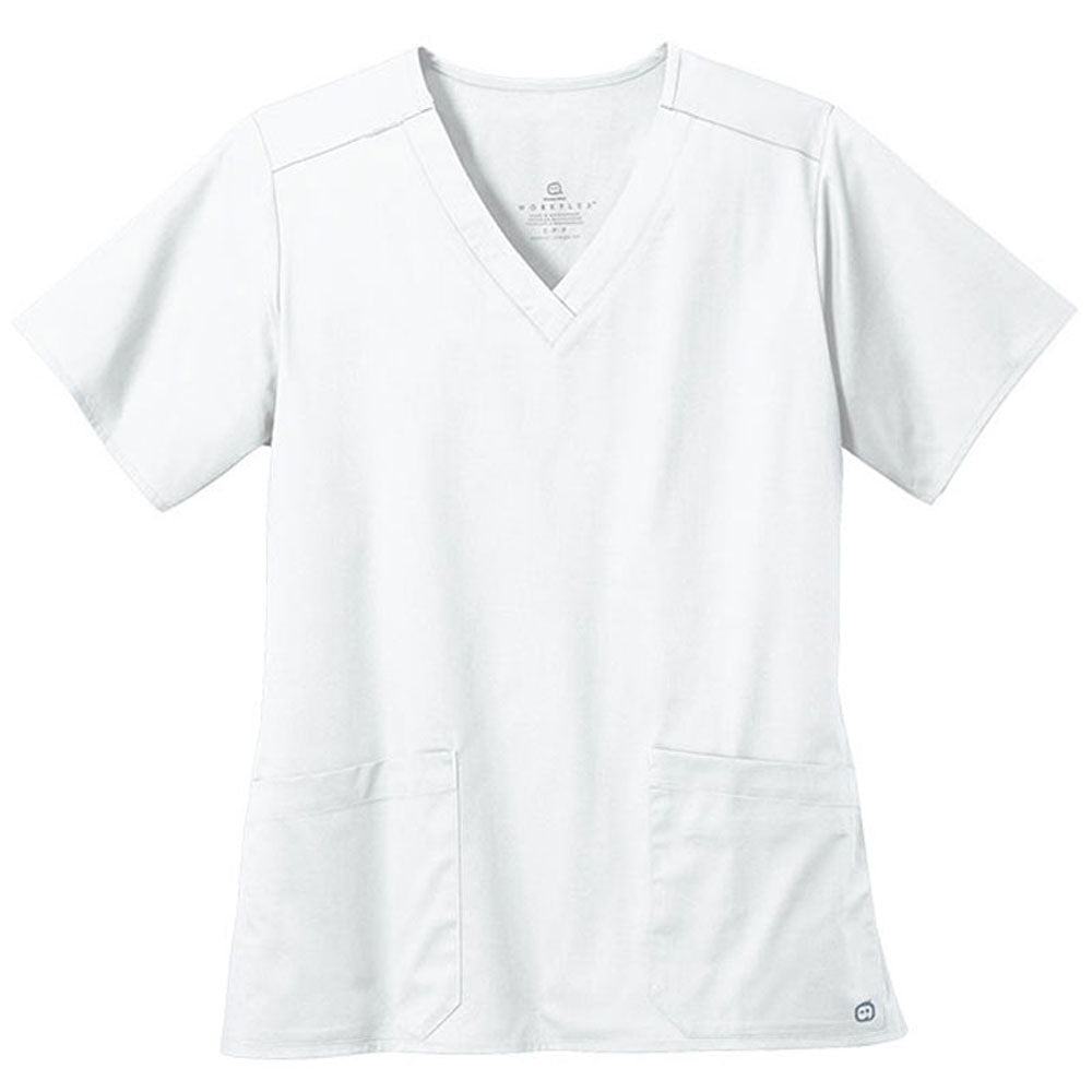 Outfitting female healthcare professionals starts with the WonderWink Women's White WorkFlex V-Neck Top. A great place for you to add your company's custom logo, this stylish piece of apparel is made from a comfortable mechanical stretch fabric and includes awesome extras like a shoulder badge loop and dual front pockets.