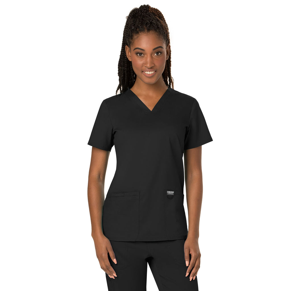 Send your business on the fast track to higher sales by ordering the logoed Cherokee Women's Black Workwear Revolution V-Neck Top. The stylish corporate apparel includes a large imprint area for adding a custom logo to reach more potential patients at industry trade shows. Enjoy the classic v-neck fit that features a right double patch pocket and instrument loop to give you access to all of your most important healthcare tools. Nearly 80% of the fabric consists of rugged polyester that withstands the rigors of 12-hour shifts. Just enough spandex twill improves mobility to help you move quickly around patients who require the deft touch of your skilled hands.Highlights