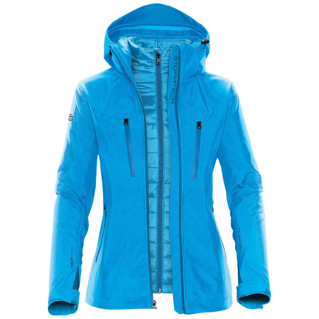 This Stormtech Women's Electric Blue Matrix System Jacket is the employee apparel solution that you need for your team. Featuring H2XTREME technology that offers breathable waterproofing, and a removable storm hood, this jacket is perfect for wet weather. The zip-out liner can be worn separately or with the shell, giving this jacket a temperature rating all the way down to -4 Degree F. Finished with articulated elbows, abrasion resistant hand pockets, and ample room on both pieces for custom company logo embroidery, this jacket is the corporate gift or uniform option you have been looking for.Corresponding Men's Style: Stormtech Men's Electric Blue Matrix System Jacket