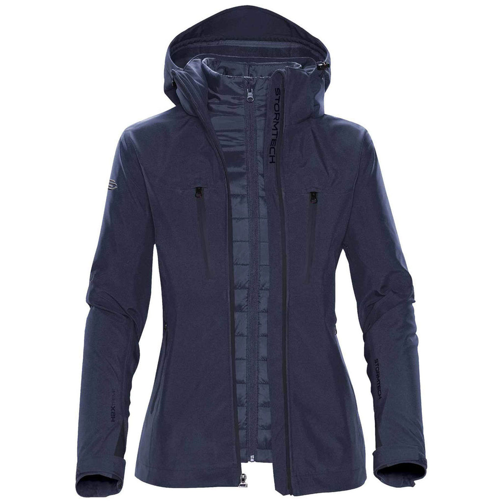 This Stormtech Women's Navy/Navy Matrix System Jacket is the employee apparel solution that you need for your team. Featuring H2XTREME technology that offers breathable waterproofing, and a removable storm hood, this jacket is perfect for wet weather. The zip-out liner can be worn separately or with the shell, giving this jacket a temperature rating all the way down to -4 Degree F. Finished with articulated elbows, abrasion resistant hand pockets, and ample room on both pieces for custom company logo embroidery, this jacket is the corporate gift or uniform option you have been looking for.Corresponding Men's Style: Stormtech Men's Navy/Navy Matrix System Jacket