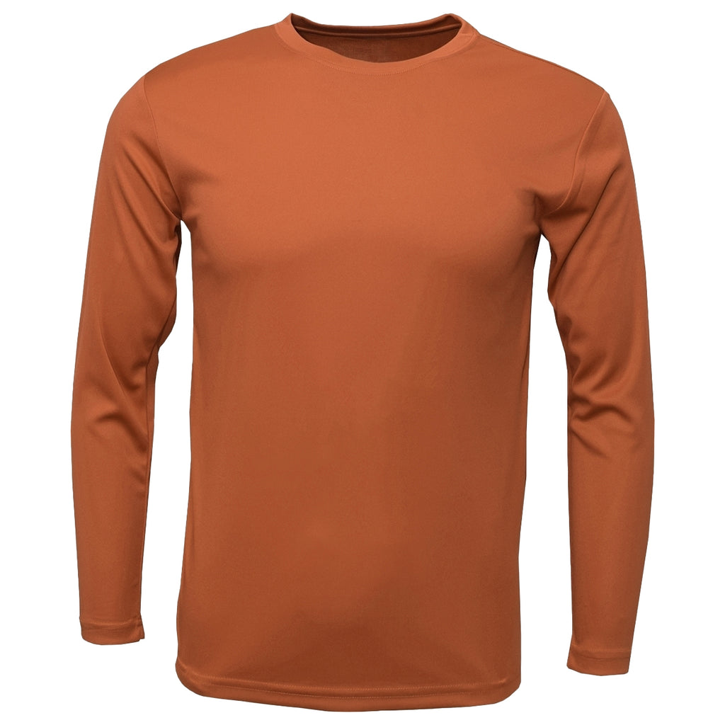 Not only will the BAW Men's Texas Orange Xtreme Tek Long Sleeve Shirt fit into your promotional plans, it will fit the men to a "T" . Your custom logo will stand out on any one of the available colors from brown to bright green. It has a crew neck and double needle hems. The breathable polyester fits like a glove without sagging and bagging. It is ideal for corporate sponsorships, company events and give-away incentives. This is a handsome shirt that will be enhanced with your custom logo. Those who see someone wearing it will be sure to ask where it was received, and the wearer only has to point to his chest.Corresponding Women's Style: BAW Women's Texas Orange Xtreme Tek Long Sleeve Shirt