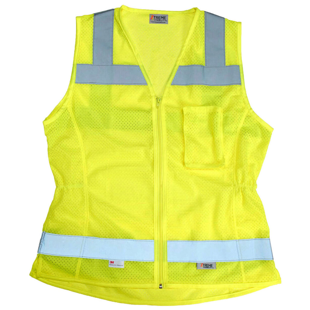 Get noticed with custom Xtreme Visibility Women's Yellow Fitted Class 2 Vest in compliant yellow eyelet mesh fabric. This more form fitting vest is perfect for the women on your crew whether building homes, directing traffic, or scaling utilities poles. Add a company logo embroidery to this vest that is ANSI 107-2015 compliant and noticeable. The zipper front has one chest cell phone pocket and 2-inch reflective material for higher visibility in all conditions. Made a bit smaller for female employees, this vest is a must have for comfort and safety. Place an order today to make sure your company keeps employees safe and seen on jobs.Highlights